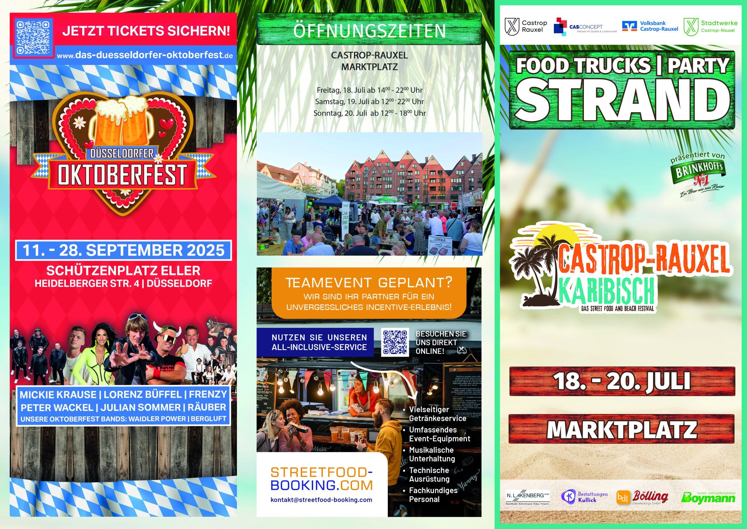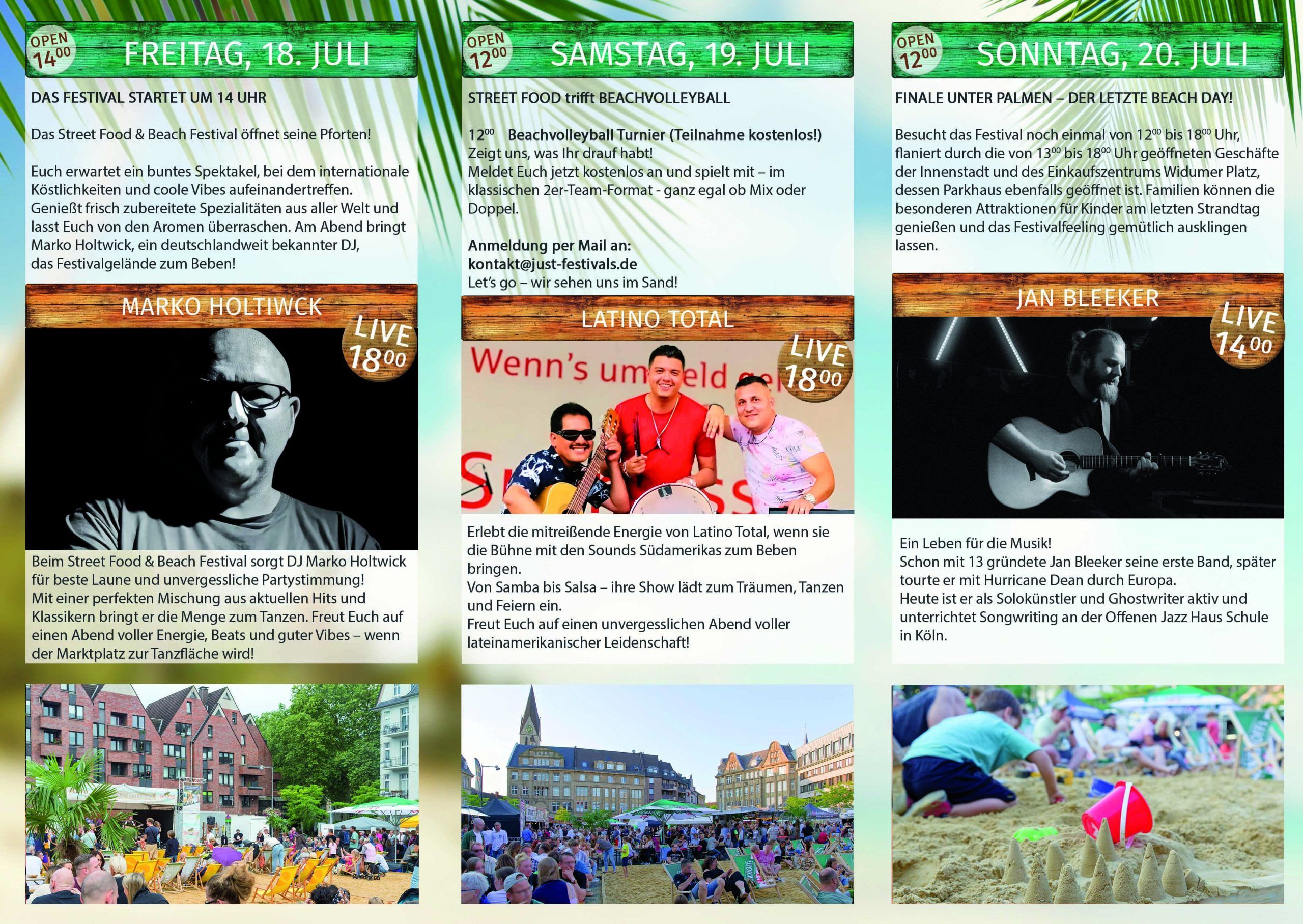 Erlebt einen Urlaubstraum direkt in der City beim Street Food & Beach Festival! Entspannt euch in unserem Strandbereich, umgeben von echten Palmen und gemütlichen Liegestühlen. Lasst euch von den lebhaften Klängen von Latin, Salsa und Reggae verzaubern und nehmt am aufregenden Beachvolleyball-Turnier teil.