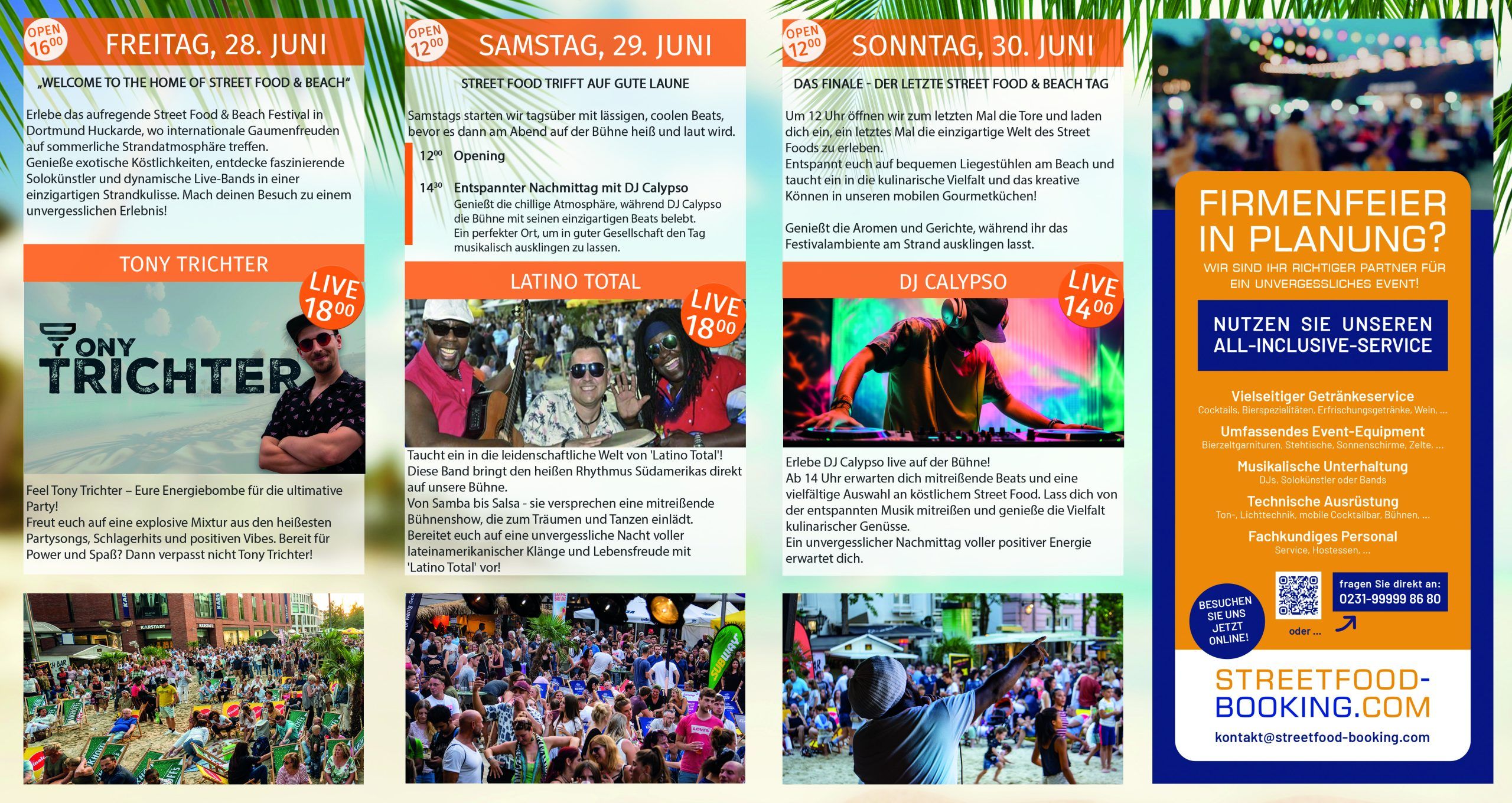 Erlebt einen Urlaubstraum direkt in der City beim Street Food & Beach Festival! Entspannt euch in unserem Strandbereich, umgeben von echten Palmen und gemütlichen Liegestühlen. Lasst euch von den lebhaften Klängen von Latin, Salsa und Reggae verzaubern und nehmt am aufregenden Beachvolleyball-Turnier teil.