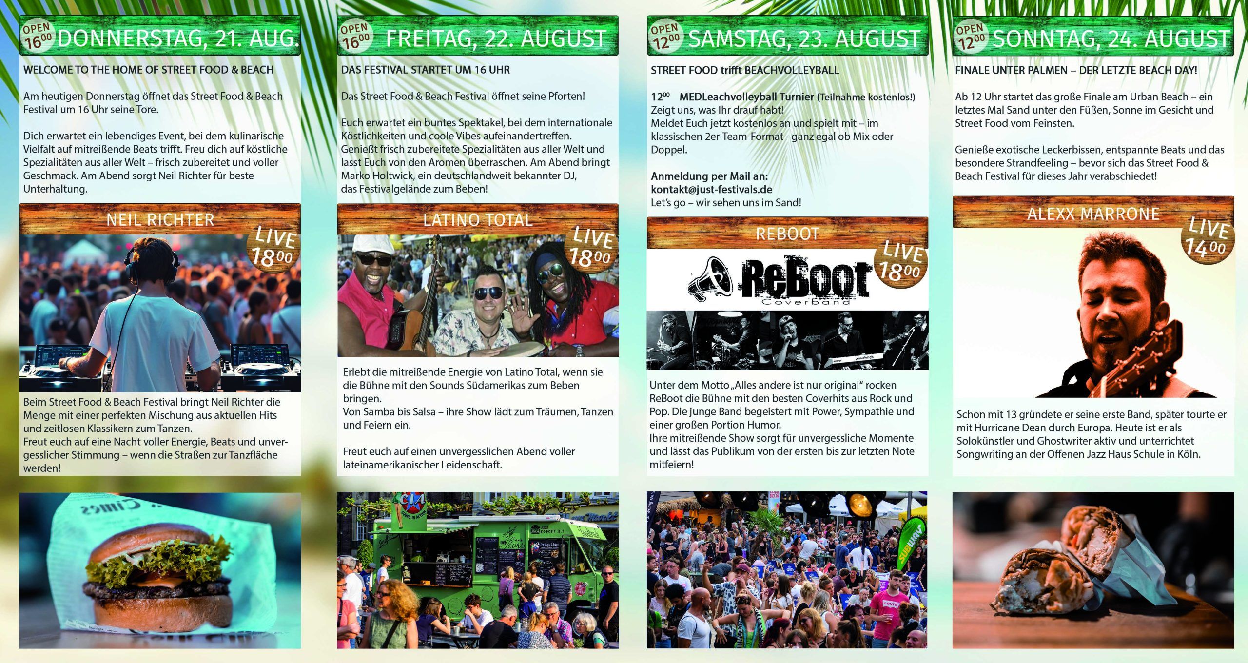 Erlebt einen Urlaubstraum direkt in der City beim Street Food & Beach Festival! Entspannt euch in unserem Strandbereich, umgeben von echten Palmen und gemütlichen Liegestühlen. Lasst euch von den lebhaften Klängen von Latin, Salsa und Reggae verzaubern und nehmt am aufregenden Beachvolleyball-Turnier teil.